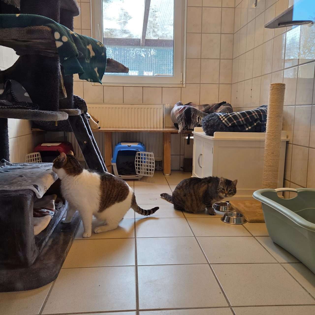 Ganz plötzlich ist das Frauchen von Bärchen (grau-weiß) und seinem Bruder Findus (Grautiger) verstorben und so mussten die zwei stattlichen Jungs unfreiwillig zu uns ziehen. 🙁 Zu Anfang waren sie leider gar nicht so begeistert von dieser Tatsache, wobei es auch nicht half, dass beide erst einmal mit Augensalbe behandelt werden mussten.