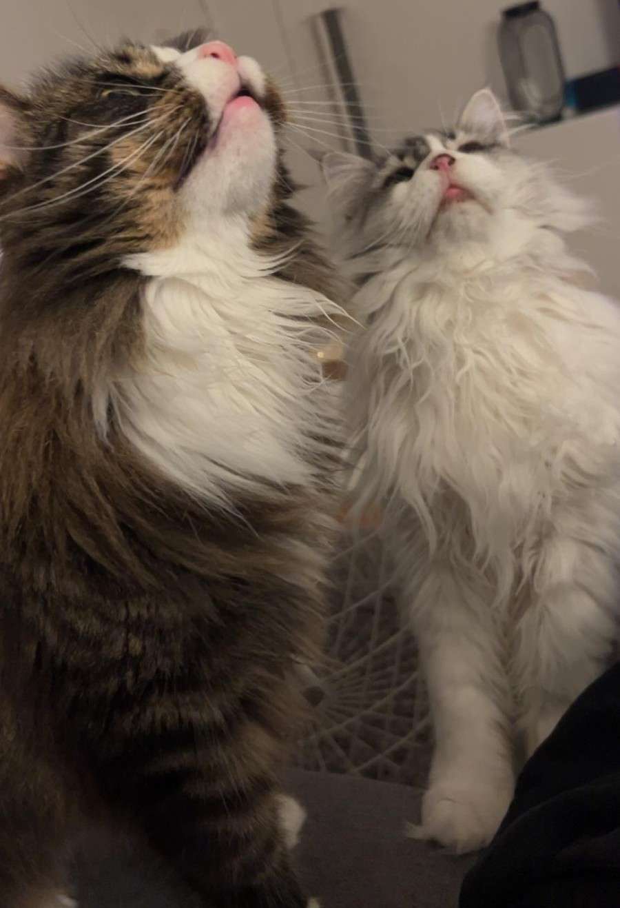 Mia (grau mit weiß) ist ebenso verschmust und verspielt und absolut pflegeleicht bis auf ihr Fell, das regelmäßig gekämmt werden sollte. Aufgrund eines Herpes-Virus mussten ihr nahezu alle Zähne gezogen werden, aber bis auf gelegentliches Säubern der Augen mit einem Augen-Wasser ist nichts nachgeblieben, was aber gelegentlich kontrolliert werden sollte.